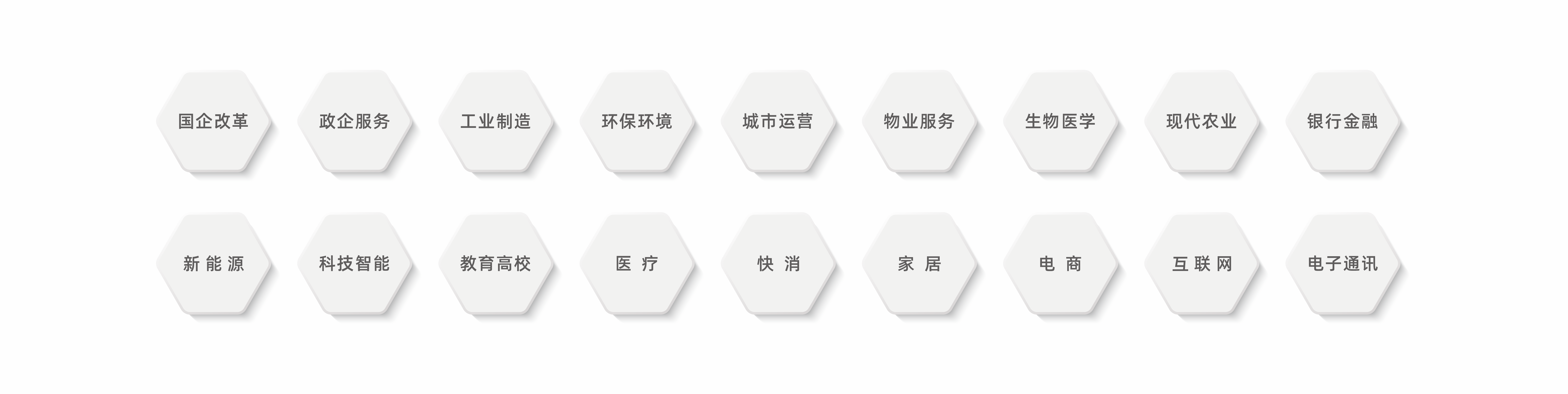 国企改革、政企服务、工业制造、环保环境、城市运营、物业服务、生物医学、现代农业、银行金融、